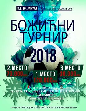 U organizaciji Sportskog saveza, a pod pokroviteljstvom loklane samouprave, u opštini Prijepolje po treći put će biti organizovan Božićni turnir u malom fudbalu. Turnir počinje 8. januara 2018. i traje tri dana. Iz organizacionog odbora očekuju veliki broj ekipa, jer kako ističu interesovanje je već na zavidnom nivou.Utakmice će se igrati u Sportskoj dvorani Gimnazije.