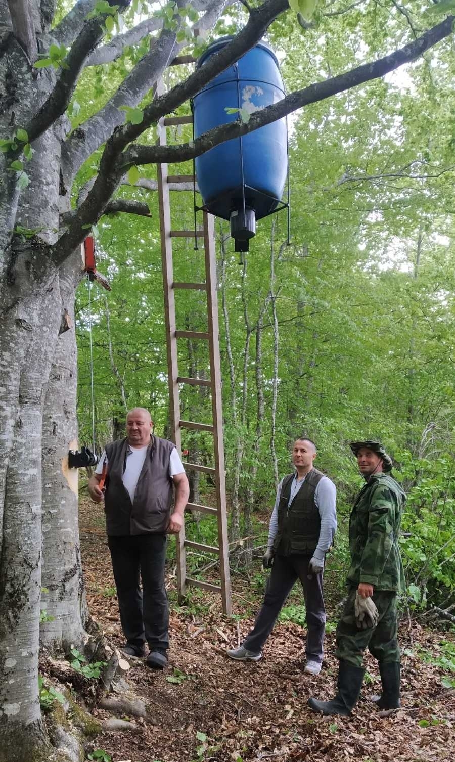 -Hranilica je ustvari adaptirano plastično bure zapremine 200 litara, koje se kači na drvo. Na njegovo dno instaliran motorčić na digitalno upravljanje, koji u programirano vreme iz hranilice izbacuje određenu količinu kukuruza kako bi nahranili divljač. Mehanizam pokreće baterija koja se puni preko solarne ploče- objašnjava Leković.