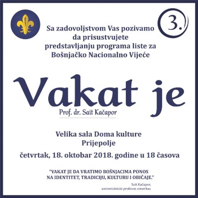 U četvrtak, od 18 časova u Velikoj sali Doma kulture biće predstavljen program izborne liste “Vakat je” u okviru izbora za Bošnjačko nacionalno vijeće. Osnovni ciljevi liste „Vakat je“ za koje će se zalagati kandidati su da se Bošnjacima vrate ponos na identitet, tradiciju kulturu i običaje. Inače nosilac, prvi na listi je prof. dr Sait Kačapor.
